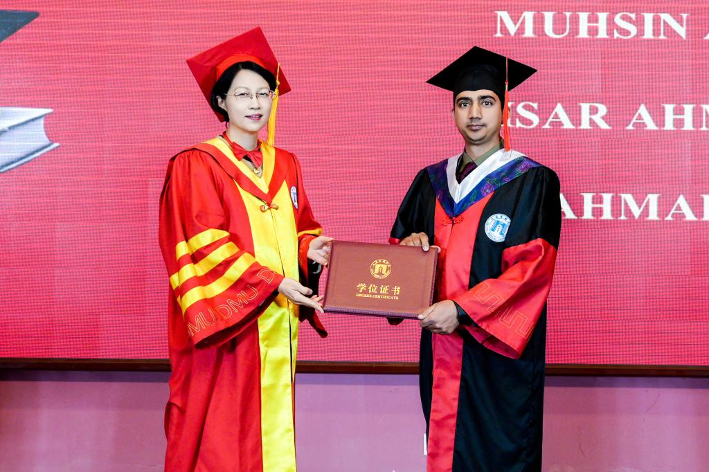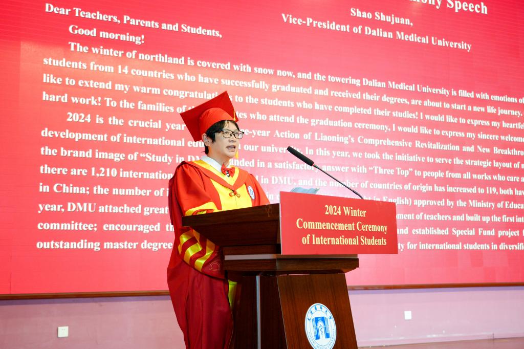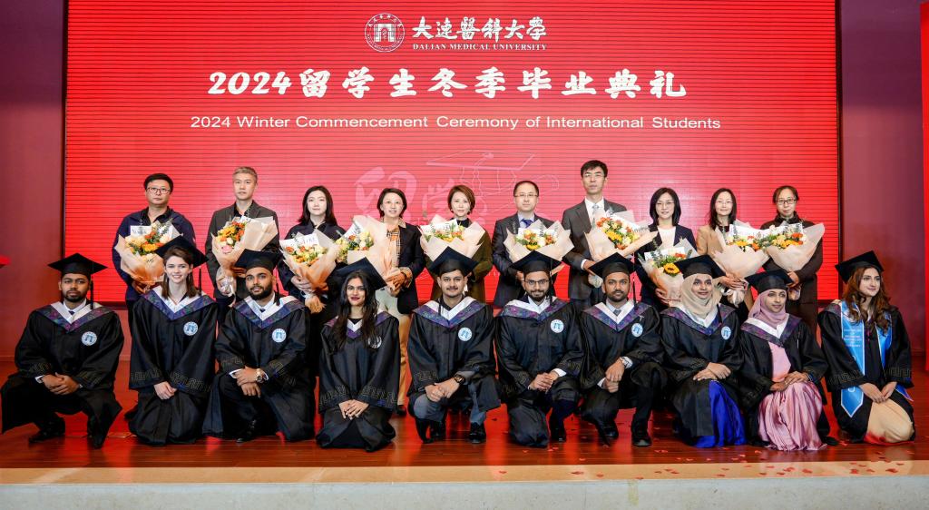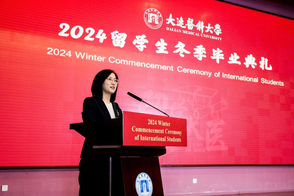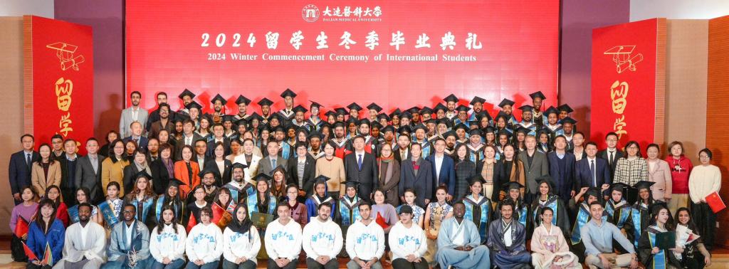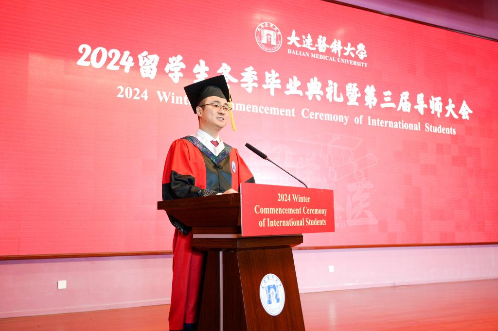 对来自14个国家的84名国际学生顺利完成学业表示热烈祝贺并表达了殷切期望:“明仁、济世”,践行医者仁心的光荣使命;“甚解、敏行”,提升妙手丹心的精湛技艺;“开放、交流”,推动构建人类命运共同体。