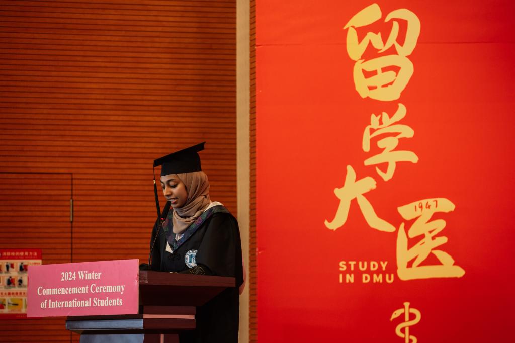 来自临床医学本科专业的留学生法赫拉代表毕业生发言,她对母校的培养表示感谢并表示今后会以大医校友身份继续发光发热,传承大医精神。