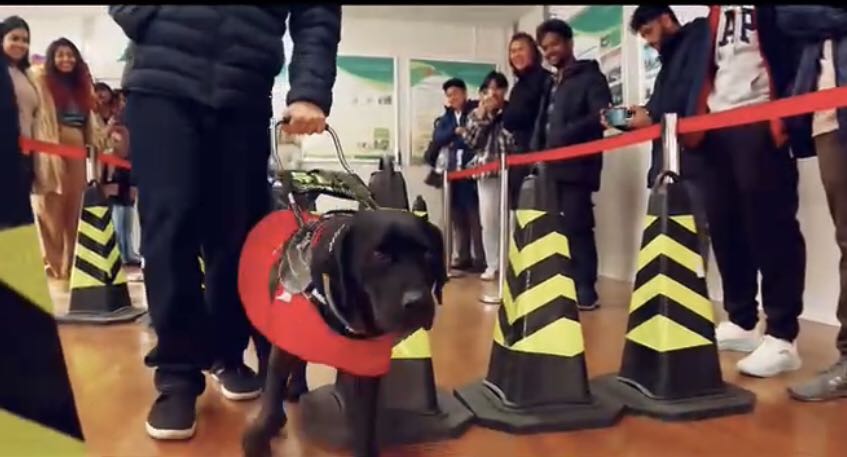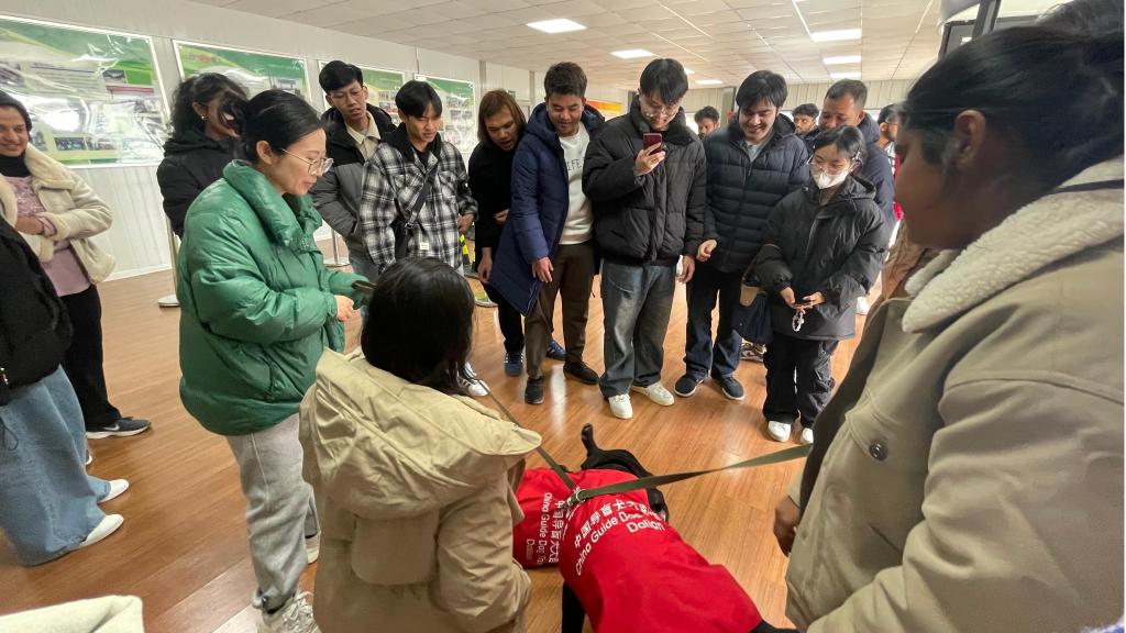 随后,留学生们在专业训练师的指导下,体验了在导盲犬引导下通过障碍物。导盲犬凭借着精准的判断和训练有素的技能,耐心地引导着留学生绕过障碍物,安全地抵达目的地。过程中,留学生们与导盲犬建立了短暂却深厚的信任,感受到了导盲犬为视障人士带来的希望与力量。