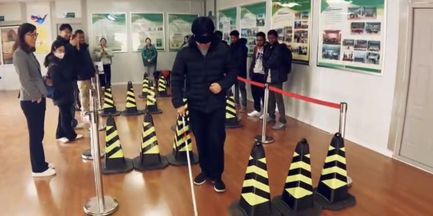 在对导盲犬基地有了初步了解后,留学生们跟随老师来到导盲犬模拟训练场,观看了训练师与导盲犬之间的默契配合。在互动环节里,同学们获得了一次特殊的体验——戴上眼罩,手持盲杖,模拟盲人走路。一开始,留学生们步伐谨慎而缓慢,在黑暗中摸索前行,深刻体会到了盲人出行的不便与艰难。