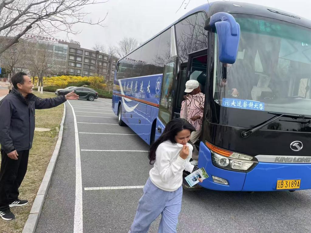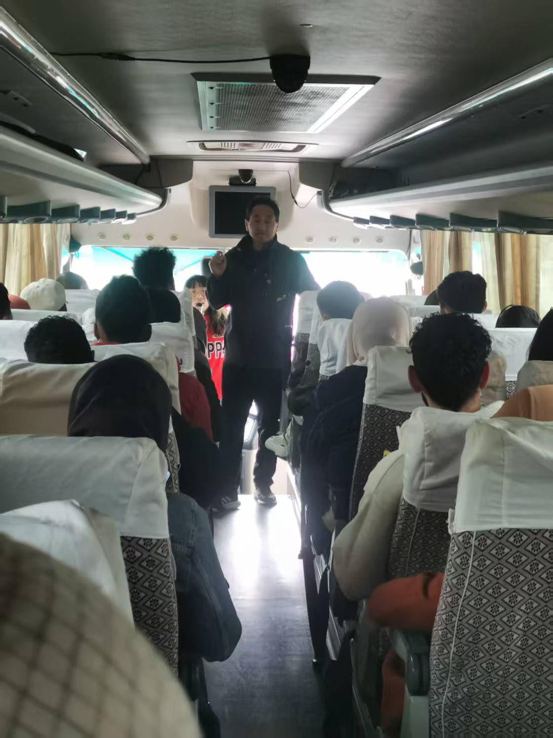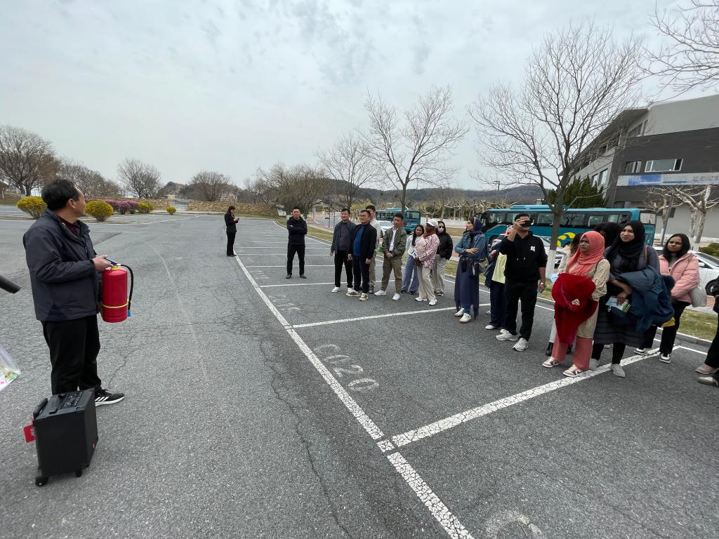 演练开始前,后勤管理处的张文舵主任详细为留学生讲解了干粉灭火器的结构、工作原理和使用方法;之后,师生们来到大巴车上,张老师针对车内安全带、安全锤、应急开关和车顶逃生窗的使用进行了介绍,让留学生们对大巴车应急逃生有了初步的认识。